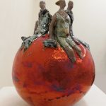 Ogni attore delle ribalte teatrali di Paolo è una creatura silente, assorta in pensieri impossibili da comunicare, come fosse un kouros; oppure, una kore, quando un accenno di seno traspaia sotto le trame d’una ceramica d’eleganza sobria messe a fasciare il busto. Creatura solitaria anche quando sola non sia. Anche quando salga sul carro con altri personaggi; o, con altri ancora, cavalchi – in una giostra in miniatura – uno di quei cavallini ritti sulle zampe di dietro, che in circolo s’inseguono senza speranza di raggiungersi mai. Donne e uomini di fiaba che se ne stanno seduti su mondi a loro estranei, volgendosi – disinteressati l’uno dell’altro – le spalle. Figure raggelate nell’indifferenza; pronte, ora a partire per viaggi che l’esigue valigie lasciano presagire di piccolo tragitto, ora a farsi carico, come fossero della stessa schiatta d’un Atlante primordiale, del peso d’un globo. (…)