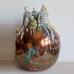 Nato a Scandicci nel 1943, Paolo Staccioli inizia la sua esperienza di artista negli anni Settanta del Novecento, esordendo come pittore e facendosi presto notare in ambito locale. Al principio degli anni Novanta la necessità di sperimentare nuovi linguaggi espressivi lo spinge a Faenza, nella bottega di un ceramista locale, Umberto Santandrea, dove apprende le tecniche di quest’arte. È qui che Staccioli realizza i suoi primi vasi, dapprima con la tecnica della ceramica invetriata, poi sperimentando la cottura a “riduzione”, che gli consente di ottenere straordinari effetti d’iridescenza e lucentezza. Ottenuta assoluta padronanza del mestiere, Staccioli allestisce nel suo studio di Scandicci, nei pressi di Firenze, un laboratorio, dove continua autonomamente e quotidianamente a misurarsi con l’uso del fuoco e degli ossidi di rame, dando vita a una miriade di vasi che riveste con fantastici racconti pittorici, fissati definitivamente dalla smaltatura a lustro. È con queste opere che ottiene i primi successi, facendosi notare in mostre personali e collettive, nonché in occasione di importanti manifestazioni culturali: le sue ceramiche, dal forte effetto metallizzato e dallo smalto scintillante si impongono presto, per eleganza e originalità, nel panorama artistico non più solamente fiorentino, ma nazionale. I personaggi che in questa fase popolano la superficie delle sue ceramiche (giostre di cavalli giocattolo sospesi nell’aria e accompagnati da putti alati, suonatori di trombe, bambole e Pulcinella) presto si guadagnano la terza dimensione, divenendo sculture che tuttavia non perdono l’accento di accadimento fiabesco, estranee come sono ad ogni nozione di tempo e luogo: forme idealizzate memori della statuaria preromana, etrusca in particolare, sulle quali interviene la policromia della ceramica, a rendere un vigoroso effetto di masse in contrasto.