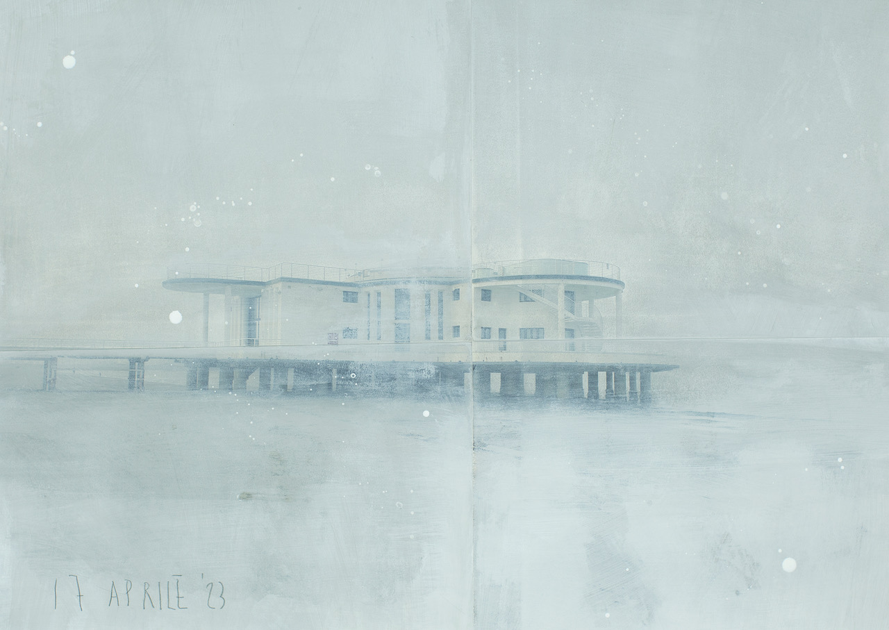 Anche in passato la ricerca di Ventura si è concentrata su singole città, come nella serie dedicata a Milano iniziata nel 2021 e tutt’ora in corso, ed è in questo filone che si inserisce questo nuovo lavoro ambientato a Senigallia. Lo sguardo dell’artista si è concentrato su scenari meno turistici ma non per questo meno affascinanti della città: ad assumere interesse per lui non è la canonica bellezza dei luoghi che uniforma le vedute cittadine, ma piuttosto le sue contraddizioni come il sovrapporsi di stili ed epoche che spesso producono uno iato architettonico. Troviamo così palazzi degli anni ’60 che si mescolano con altri degli anni ’70, hotel del lungomare giustapposti a case di pescatori, di casellanti e a pollai. L’occhio si sofferma sulle stratificazioni del paesaggio senza nessuna volontà di denuncia, ma anzi con la voglia di conoscere meglio il contesto per poterlo usare e modificare e dare vita così a nuovi luoghi che acquistano un ulteriore valore e visione, quasi metafisici e fuori dal tempo.