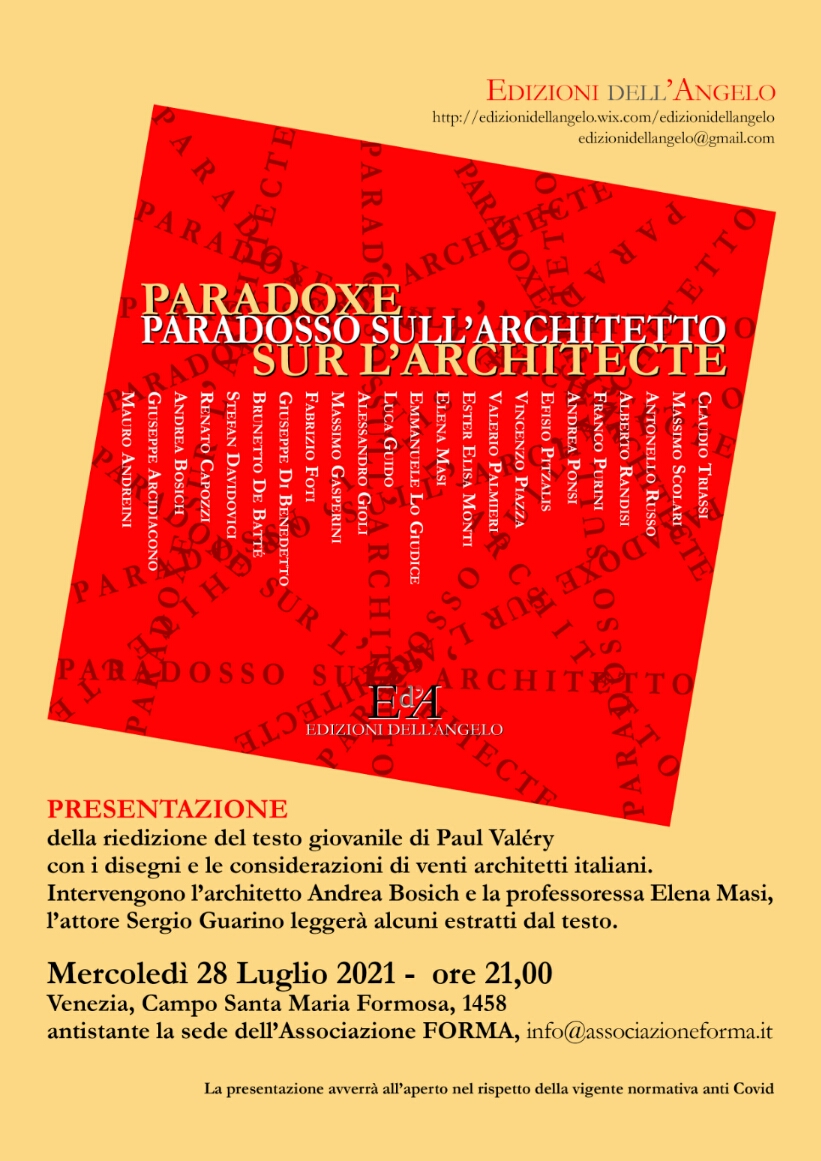 Presentazione della riedizione del testo di Paul Valery “Paradoxe sur l’Architecte” pubblicato dalle “Edizioni dell’Angelo”: proiezioni di immagini, interventi dell’architetto Andrea Bosich e della professoressa Elena Masi con l’attore Sergio Guarino che leggerà alcuni estratti dai tesi.