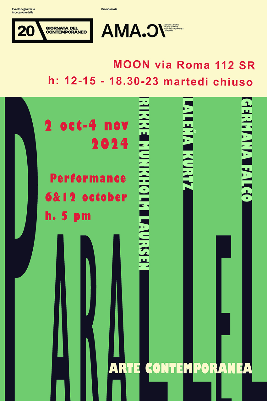 Negli spazi di Moon, verranno esposti i lavori di Laleña Kurtz, Rikke Munkholm Laursen, Germana Falco, un incontro tra visioni parallele, tre artiste di nazionalità differente si incontrano, intrecciando il loro sentire Arte.