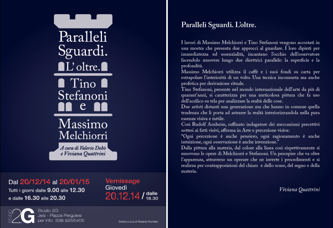 Due artisti distanti una generazione ma che hanno in comune quella tendenza che li porta ad astrarre la realtà interiorizzandola nella pura essenza visiva e tattile. Dalla pittura alla materia, dal colore alla linea così rispettivamente si muovono le opere di Melchiorri e Stefanoni.