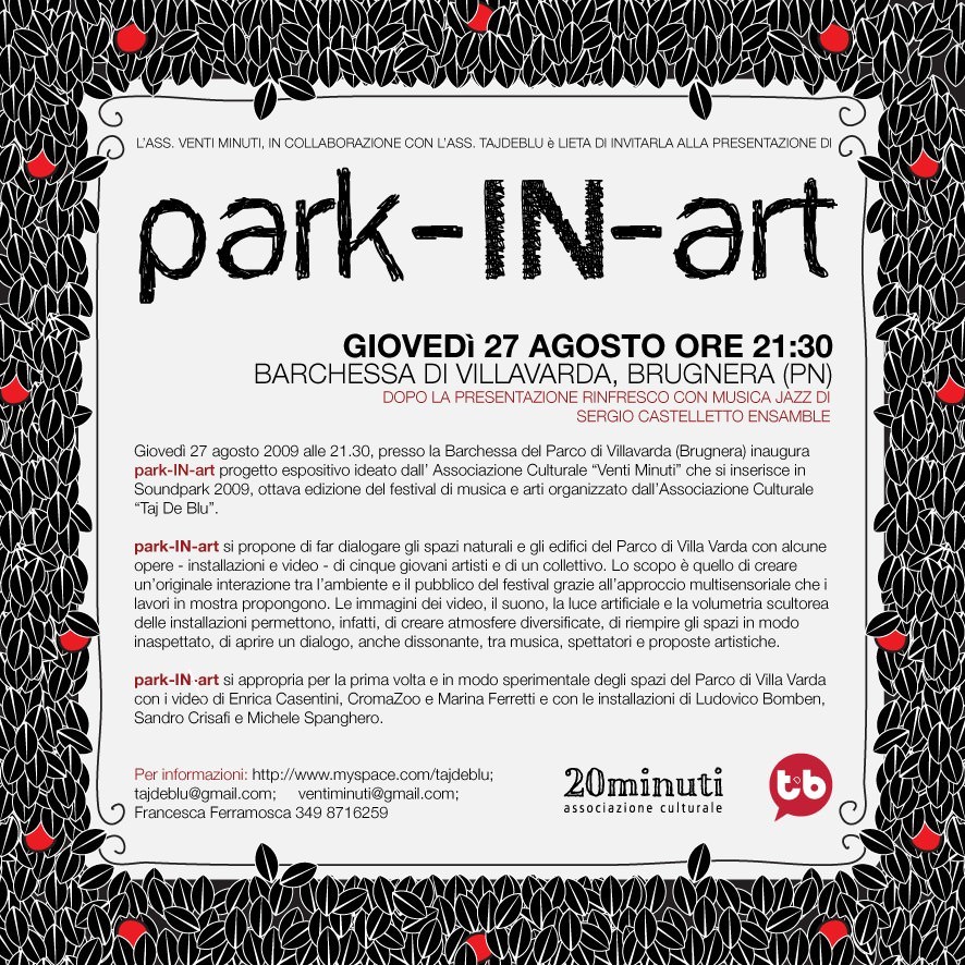 Park-IN-art è un progetto espositivo a cura di Sara Bellinato e Marta Maioni che si propone di far dialogare gli spazi naturali e gli edifici del Parco di Villa Varda con alcune opere – installazioni e video – di cinque giovani artisti e di un collettivo.