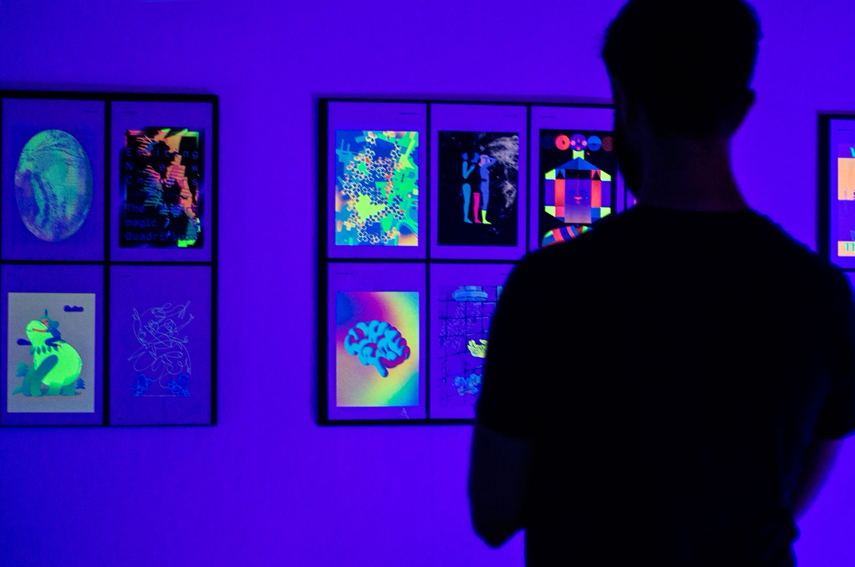 Il secondo piano di Palazzo Pigorini accoglie Quadrifluox, progetto a cura di Piergiuseppe Molinar attivo dal 2018, che nasce da un’idea radicale: l’inchiostro non deve solo assorbire la luce, ma può generarla. Attraverso l’uso dell’inchiostro fluorescente, la ricerca ridefinisce il rapporto tra carta, immagine e percezione, trasformando la stampa in un linguaggio autonomo. Sotto la luce di Wood l’opera cambia stato: l’immagine si accende, si espande, rivela livelli nascosti e dettagli invisibili. La fluorescenza non è un effetto speciale o decorativo, ma parte integrante della costruzione visiva. A Parma 360 Festival viene presentato un percorso espositivo che restituisce l’evoluzione della ricerca attraverso una selezione di opere stampate: un viaggio tra sperimentazione visiva, illustrazione e graphic novel che fonde rigore tecnico e visione artistica. Con Hello Fluo, la logica della programmazione dialoga con la stampa tipografica, fondendo digitale e analogico.