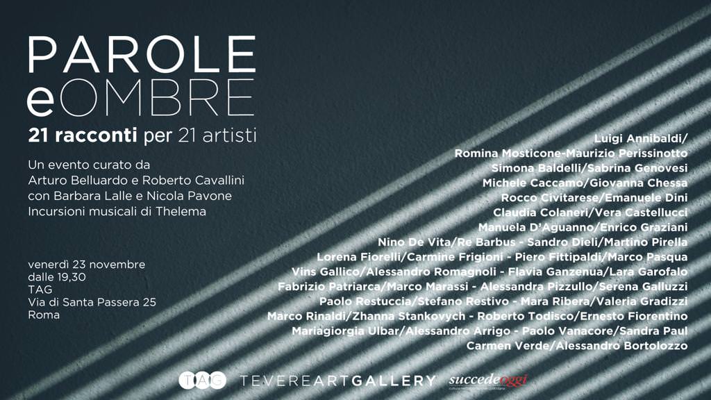 Il 23 novembre dalle 19.30 in poi alla TAG – Tevere Art Gallery di Roma, via di S. Passera, 25 si terrà la mostra-evento culmine del progetto Parole e Ombre curato per la rivista online www.succedeoggi.it dallo scrittore Arturo Belluardo e dal fotografo e critico Roberto Cavallini.