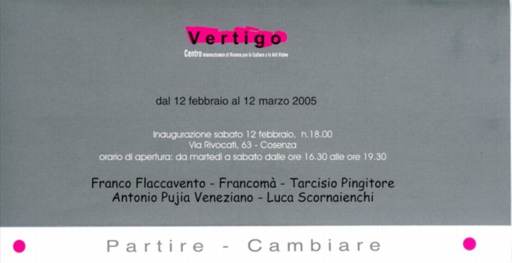 Partire, cambiare è la celebrazione della modificazione e della contaminazione di stili, di prassi nell’operatività contemporanea. Ogni cambiamento è manifestato da un’ubiquità di pensiero ben studiata dalla filosofia contemporanea, che, sulla scorta di Deleuze, si intrattiene sempre più sul concetto di nomadismo, come condizione imprescindibile dalla ricerca. Per chi sceglie di Partire, cambiare non esistono priorità: tutto può essere mescolato, studiato, amato, in una combinatoria che non esclude nessun materiale, nessun componente, nella creazione di opere il cui problematico spessore presenti il segno della nostra complessità. Da questo punto di vista grandi suggestioni vengono da Franco Flaccavento la cui ricerca ha sempre privilegiato la dimensione mentale dell’immagine come culla dell’opera; di Francomà i cui arabeschi di corpi suggeriscono un concetto di spazio piatto in cui la decorazione ha lo stesso valore della composizione; da Tarcisio Pingitore le cui opere vanno nella direzione di uno smarrimento dello spessore del dipingere, per recuperare uno spazio mentale espresso tramite la pittura; da Antonio Pujia Veneziano i cui lavori sono un’arena delle trasmutazioni di segni e materie in vista di una combinatoria tanto linguistica quanto essenziale; da Luca Scornaienchi che contraddittoriamente esprime una denuncia vibrata alla contemporaneità pur con l’utilizzazione degli stessi simulacri.