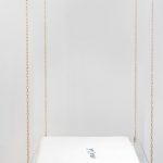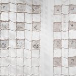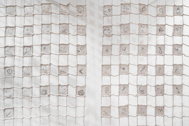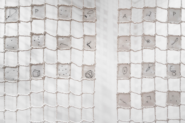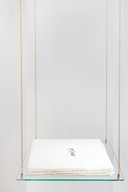 Di Nina Carini (Sicilia, anni ottanta) sono in mostra opere installative. Al centro della luna è una lunga collana di sfere, grandi e piccole, che culminano nella luna, coperta da fili neri, che la collegano all’alto. La luna le tira i capelli, la trascina. L’indagine sul tempo, come per le altre artiste di Partiture leggibili, è un elemento essenziale della sua ricerca, così come l’indagine sui temi del linguaggio. In mostra è Je t’aime (2019) composta da 110 fogli stampati a mano con inchiostro e trasparina. A ogni foglio stampato, è stata aggiunta la trasparina in dosi minime, foglio dopo foglio. Così che nell’ultimo la frase Je t’aime sparisce. È un’opera performativa. La scelta della frase non è casuale. «L’ho scelta perché è una delle frasi più complesse del linguaggio umano».