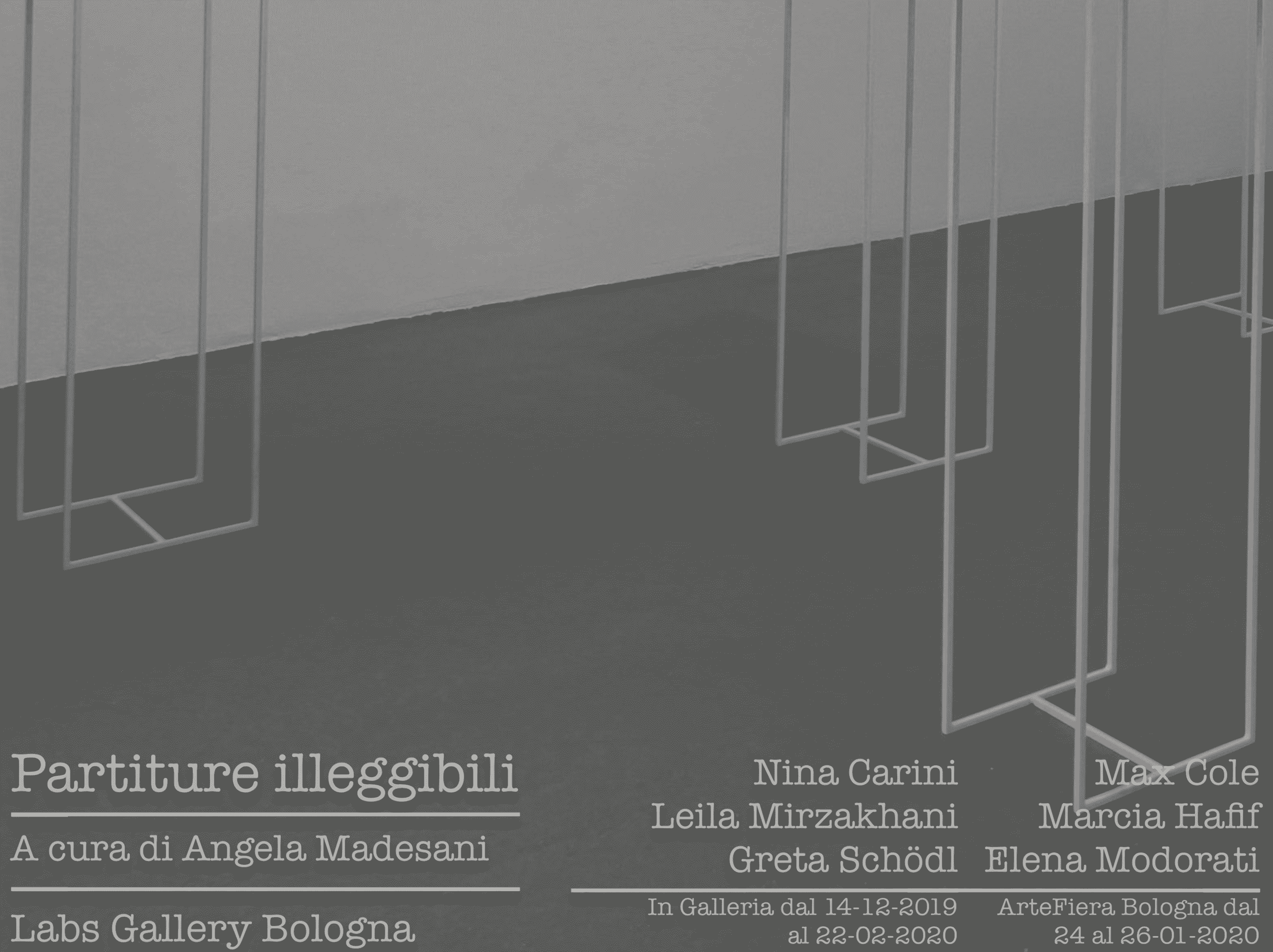 Partiture illegibili è un progetto a cura di Angela Madesani che si compone di due mostre: la prima mette in dialogo Greta Schödl, Leila Mirzakhani e Nina Carini presso Labs Gallery, in Via Santo Stefano 38 a Bologna dal 14 Dicembre 2019 al 22 Febbraio 2020; la seconda vede coinvolte Marcia Hafif, Max Cole ed Elena Modorati presso Artefiera Bologna dal 24 al 26 Gennaio 2020.