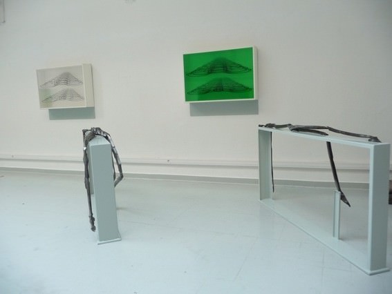 Gli stessi tre colori si ritrovano nella serie dei “Truobles” che Bazilé realizza parallelamente alle sculture. I “Troubles” rappresentano impressioni numeriche su un film trasparente incollato su piastre di plexiglas. Sovrapponendo le piastre, ogni opera mette in prospettiva la forma del disegno, sprofondandola. Si ottiene così l’immagine di un laghetto. E per lo sfasamento e la moltiplicazione delle linee e dei profili, l’immagine rende l’idea delle onde provocate da un sasso gettato in acqua, in una visione evanescente molto simile a quella che si ha tenendo gli occhi aperti sott’acqua.