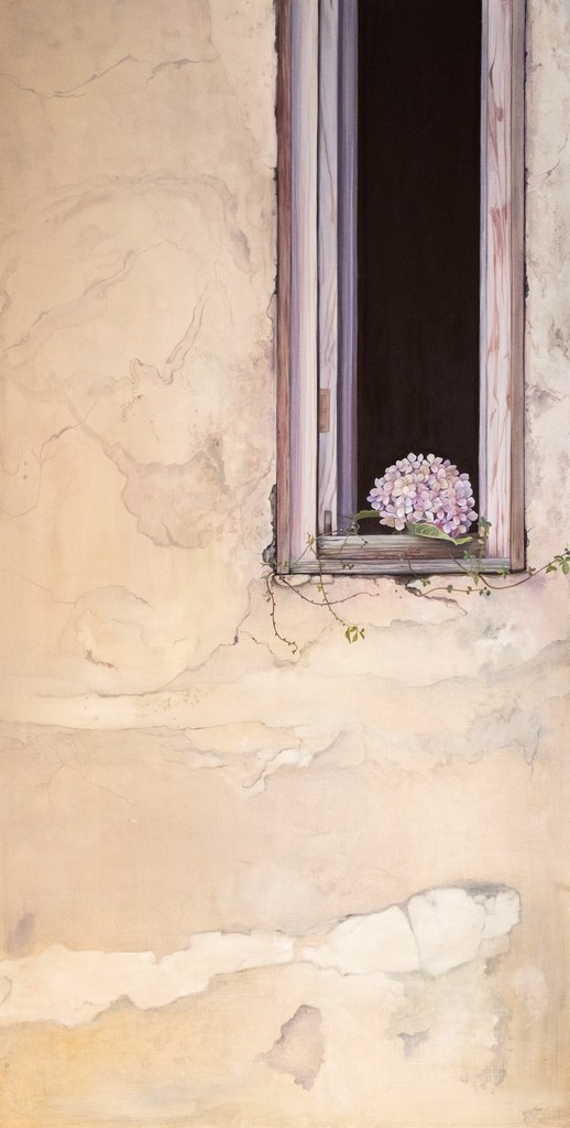 Nei dipintiesposti, circa 27 opere, l’ortensia diventa una teoria di vita, “Pianta forte”, un punto di riferimento