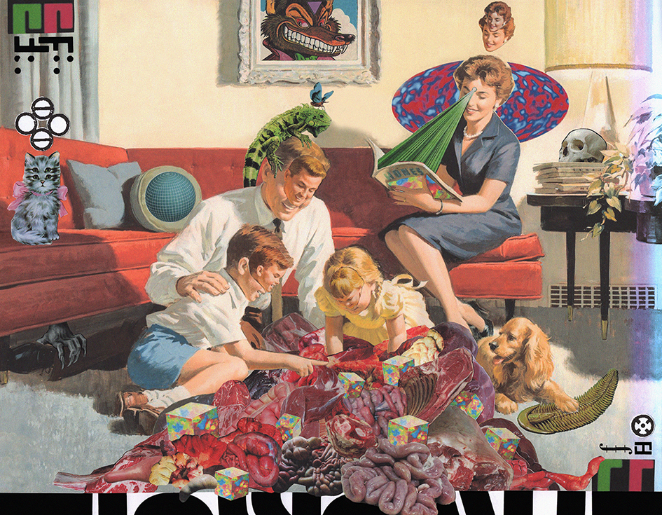 Ad unire questi tre blocchi o visioni, la mostra è arricchita da una sorta di ponte creato da un insieme di lavori che rappresentano l’antologia recente dell’autore, tra collage, disegni e gif animate, che al sorriso aggiungono un senso di sazietà.