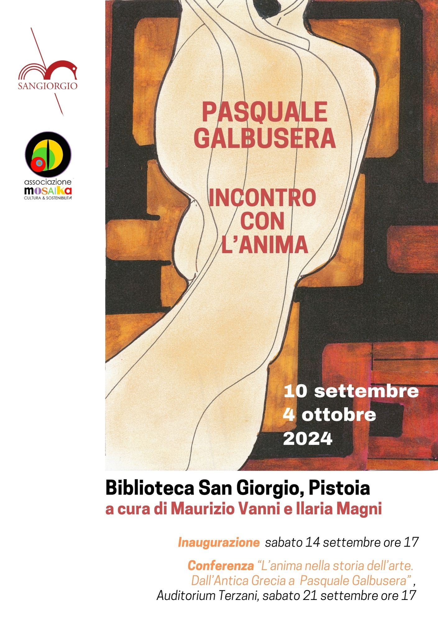 Dal 10 settembre al 4 ottobre 2024 la Biblioteca San Giorgio di Pistoia ospiterà la mostra Pasquale Galbusera. Incontro con l’anima, a cura di Maurizio Vanni e Ilaria Magni, prodotta in collaborazione con l’Associazione culturale Mosaika di Verbania, che vuole essere un omaggio all’artista brianzolo recentemente scomparso. Disegni, dipinti e sculture ci condurranno lungo un percorso visivo che avrà un unico filo conduttore tematico: l’anima. L’inaugurazione è prevista per sabato 14 settembre alle ore 17 mentre sabato 21 settembre, sempre alle ore 17, all’Auditorium Terzani si terrà la conferenza di approfondimento dei curatori su “L’anima nella storia dell’arte. Dall’Antica Grecia a Pasquale Galbusera”. A completare il progetto espositivo ci saranno due workshop di scrittura creativa affiancati da una “passeggiata creativa” tra le opere di Galbusera con Ilaria Magni: il 25 settembre “Arte e parola creativa” per gli studenti delle scuole secondarie di primo grado e il 26 settembre "La parola creativa. Come nasce un testo critico?” per quelli delle scuole secondarie di secondo grado.