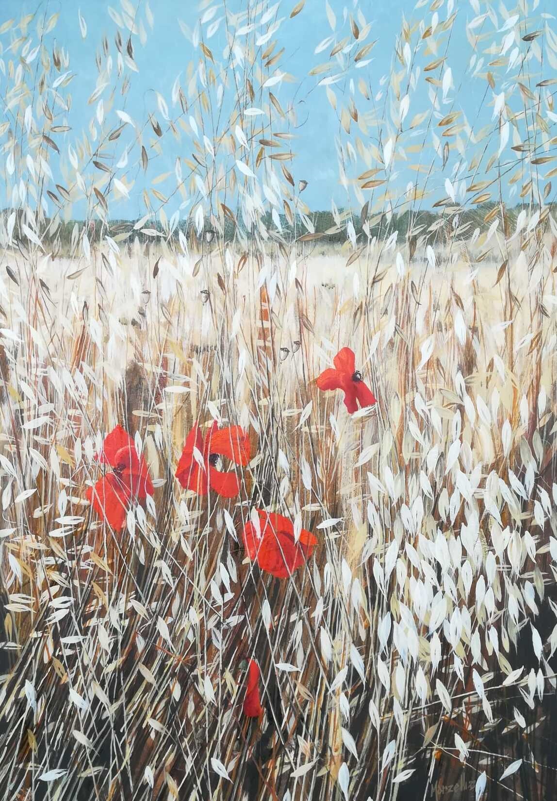 Il progetto espositivo nell’ex oratorio dei Ss. Lorentino e Pergentino di Arezzo coincide però con l’esplosione della primavera, quindi accanto alle vedute tipicamente “marzelliane” sono presenti anche alcuni dettagli di campi fioriti visti da vicino. Terreni incolti, anche questi forse trascurati dall’uomo, in cui la natura selvaggia riprende magnificamente il sopravvento su tutto e riempie ogni anfratto. Papaveri, forasacchi, campanule, spighe che senza un ordine prestabilito creano un tripudio di forme e colori nel quale – e riprendiamo il titolo dandogli un altro significato – è bello abbandonarsi.