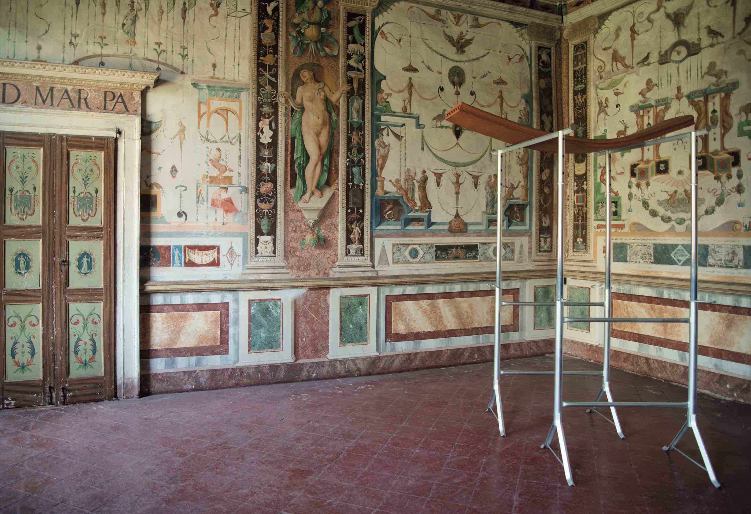 Gli artisti in mostra compongono un’ampia teoria di panorami sensibili laddove il visitatore/flâneur può addentrarsi in un percorso che – tra le sale rinascimentali e la distesa del parco di là dalle finestre che inondano gli ambienti di luce naturale – stimola l’esercizio cognitivo, la produzione incessante di inferenze, le ipotesi estetiche di passaggio al paesaggio. “Il paesaggio non è, ma accade”, scrive Lacarbonara nell’omonimo saggio (Passages | Paysages, Mimesis 2020) da cui muovono le tesi della mostra.