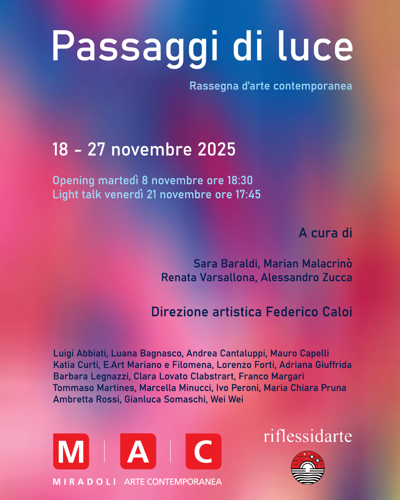Dal 18 al 27 novembre 2025 gli spazi di MAC Miradoli Arte Contemporanea accolgono Passaggi di Luce, una rassegna che si distingue per eleganza curatoriale, solidità concettuale e qualità artistica, confermandosi come uno degli appuntamenti più significativi della stagione espositiva milanese. Guidata dalla direzione artistica di Federico Caloi, la mostra riunisce voci diverse ma sorprendentemente armoniche, capaci di trasformare il tema della luce in un terreno di ricerca condiviso e al tempo stesso intimo.