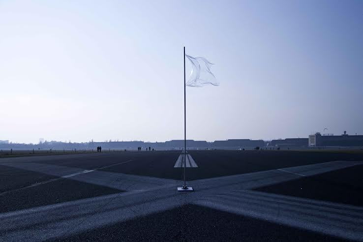 evidenziano i limiti e i confini costruiti dello spazio: il luogo della mostra è delimitato da una bandiera