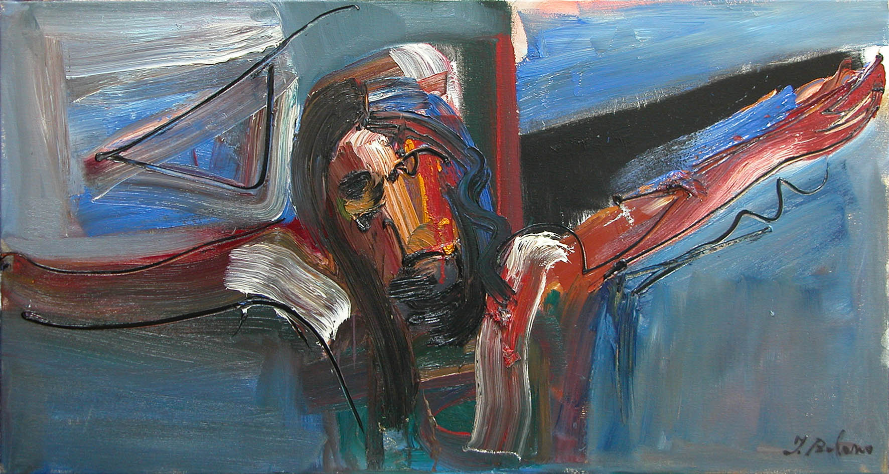 La mostra, dunque, presenta una selezione di lavori dedicati da Bolano al ciclo sul Cristo – uno dei quattro che, insieme a quelli sulla Donna Isola, sulla poesia di Mario Luzi e Napoleone, ha trattato a più e diverse riprese – che vanno da periodi dove la figura dell’uomo crocifisso è più riconoscibile e fisica ad altri invece più recenti dove ogni elemento si sfalda per lasciare spazio all’espressione diretta del dolore attraverso il colore puro in un gesto pittorico quasi violento, senza bisogno di mediazione.