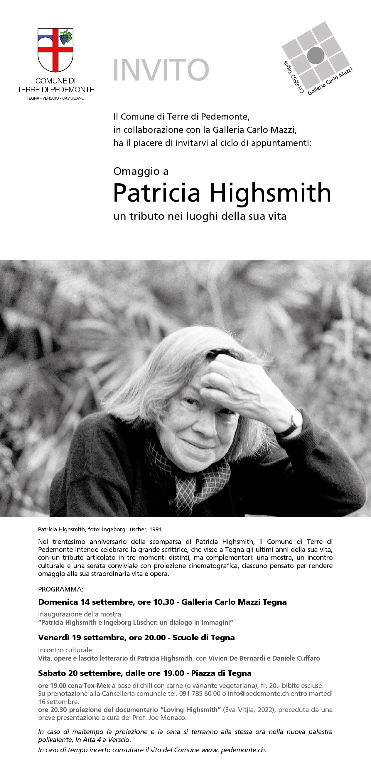 Nel trentesimo anniversario della scomparsa di Patricia Highsmith, il Comune di Terre di Pedemonte rende omaggio alla grande scrittrice, che visse gli ultimi anni della sua vita a Tegna, con un tributo articolato in tre momenti distinti ma complementari: una mostra, una serata culturale e una proiezione cinematografica. Ciascuno di essi è pensato per celebrare la sua straordinaria opera, la sua personalità complessa e il suo legame profondo con il territorio.