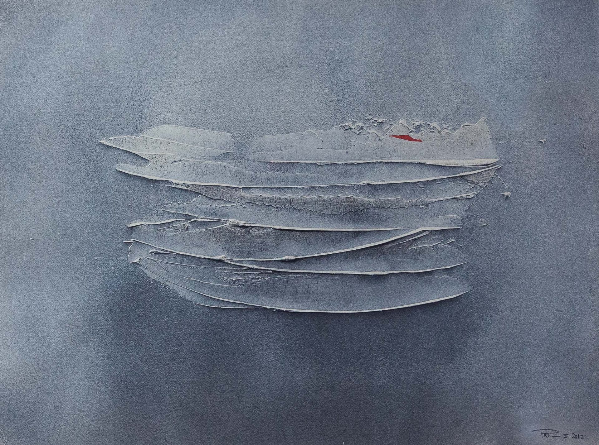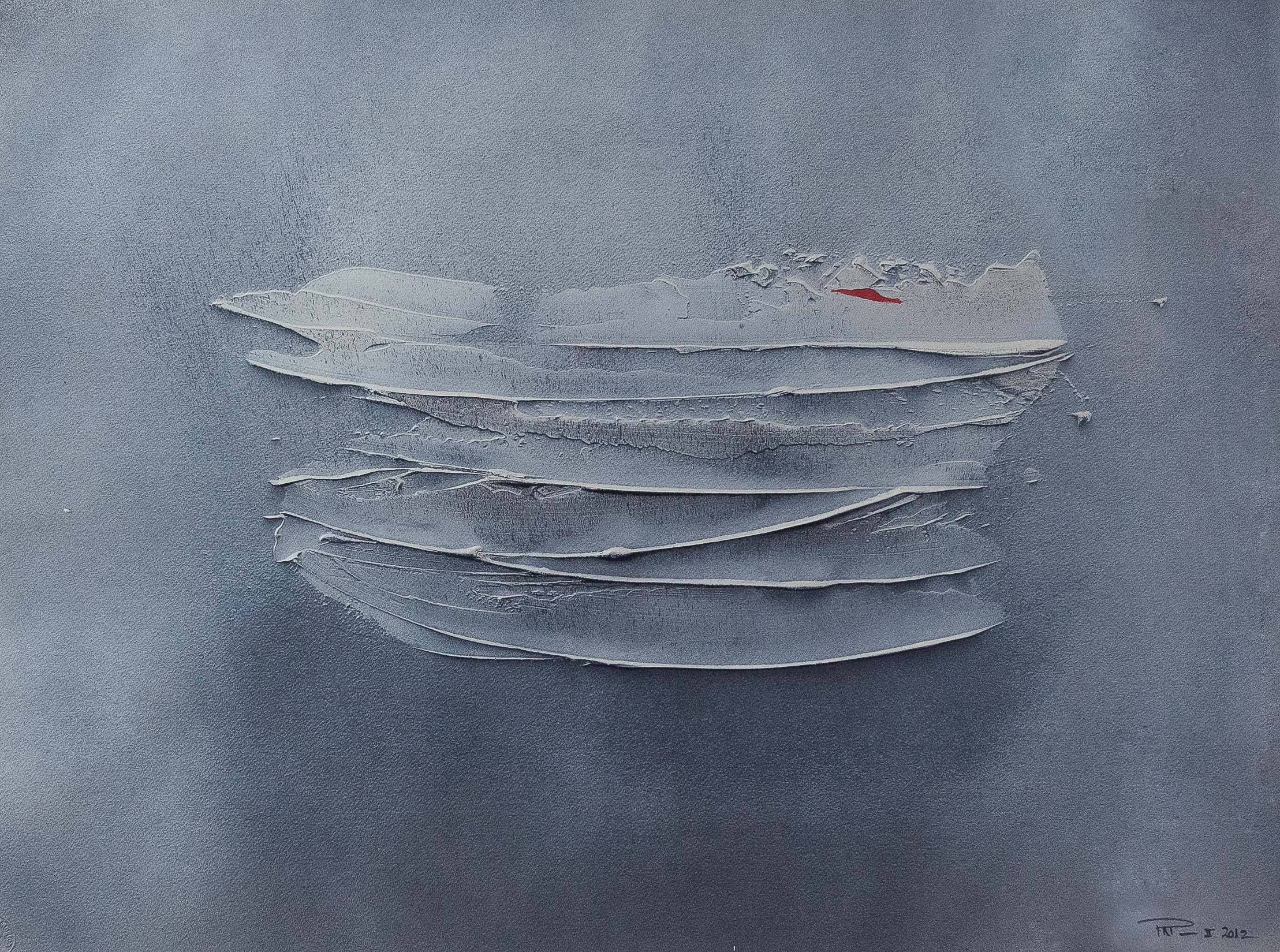 Soggetto, valutarne la presenza oggettiva, in altri casi invece il suo passaggio, un “esserci stato” che inevitabilmente va a concludersi con la sua determinata assenza. Soggetto, complemento fondamentale d'allegoria, applicato quasi come un timbro ispessito, una concreta espressione meta-calcografica oppure minima impressione al limite dell'individualismo. Tecnica mista: cartone, acrilico, colla, qua e là conglomerazioni dalla pastosa plasticità, masse spatolate, segnate, sospese, volontariamente poste alle dipendenze di fondi in progressione tonale che strutturano una loro specifica dinamica di profondità.
