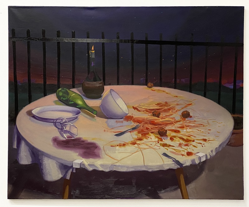 Quello di cui ci vuole parlare Bayly non è ciò che troviamo rappresentato nei dipinti: l’artista non ci racconterà di cene romantiche, della quotidianità nel suo studio, di un gruppo di amici o qualsiasi discorso di carattere personale o collettivo che potrebbe essere sotteso a queste immagini. Eppure, quasi paradossalmente, è soltanto esplorando ogni dettaglio formale che si rivela la proposizione concettuale dell’artista.