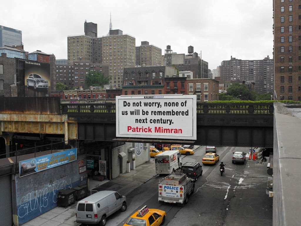 Bologna, presso la Galleria d’Arte Moderna. Nel 2007 a Tokio, Mosca, Miami e Milano, nel chiostro del Museo Nazionale della Scienza e della Tecnologia. L’idea è semplice: lanciare una discussione sull’arte attraverso frasi lapidarie scritte su enormi pannelli esposti sulla facciata o all’interno di edifici pubblici. Gli edifici che espongono i Billboard di Mimran diventano parte del processo creativo e di comunicazione e non restano un mero supporto espressivo offrendo, in questo modo, un’occasione di confronto per chi li abita o li visita. Essi, insieme all’artista, sono parte di un dialogo teso a coinvolgere e stimolare. Il desiderio di Mimran è infatti che chiunque si trovi a guardare i billboard, leggendoli, sia portato a riflettere sull’arte e sul mondo attuale. L’importante non è essere d’accordo con le sue frasi, ciò che conta è discuterne. In quest’ottica le architetture che ospitano i Billboard diventano uno strumento per interpretare la realtà che ci circonda. Dal 16 settembre 2008 al 15 settembre 2009 Patrick Mimran sarà anche a Milano, nel chiostro del Museo Nazionale della Scienza e della Tecnologia “Leonardo da Vinci”, con l’installazione "Billboard Project: talking about science and technology”.