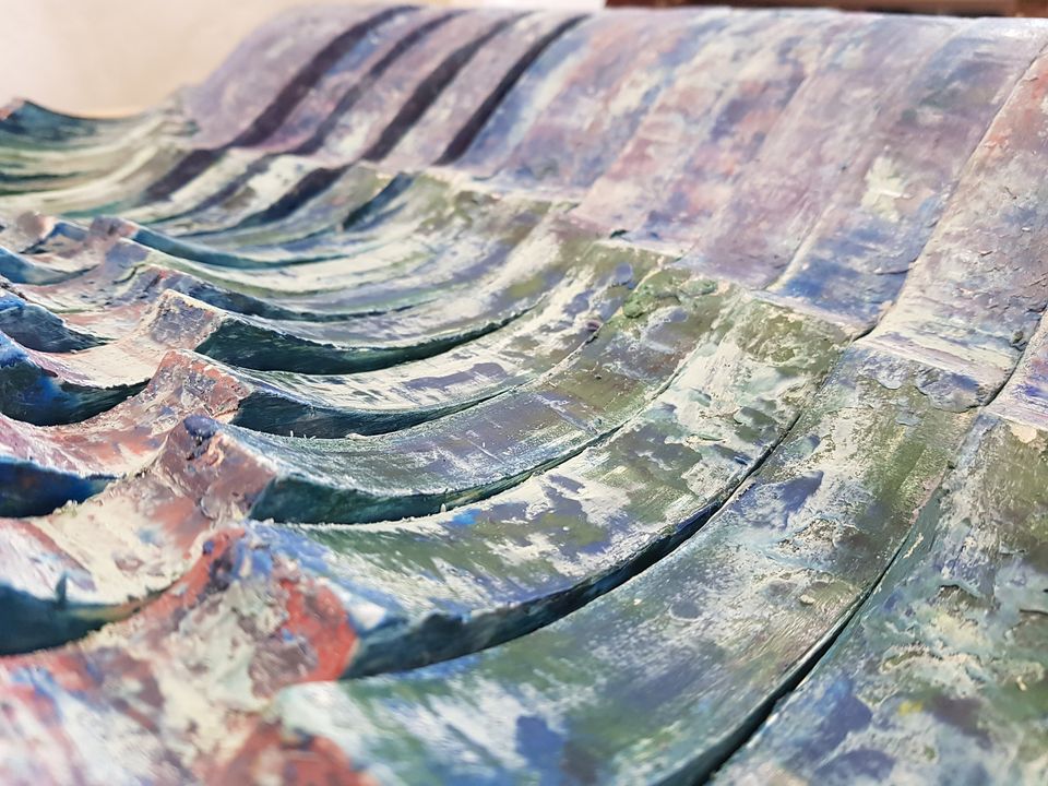 Lì le sculture-mare di Bonardi formavano una grande installazione dal titolo Onde anomale 2019, pesanti e minacciose onde verticali che avevano perso i loro colori travolgendo la terra.