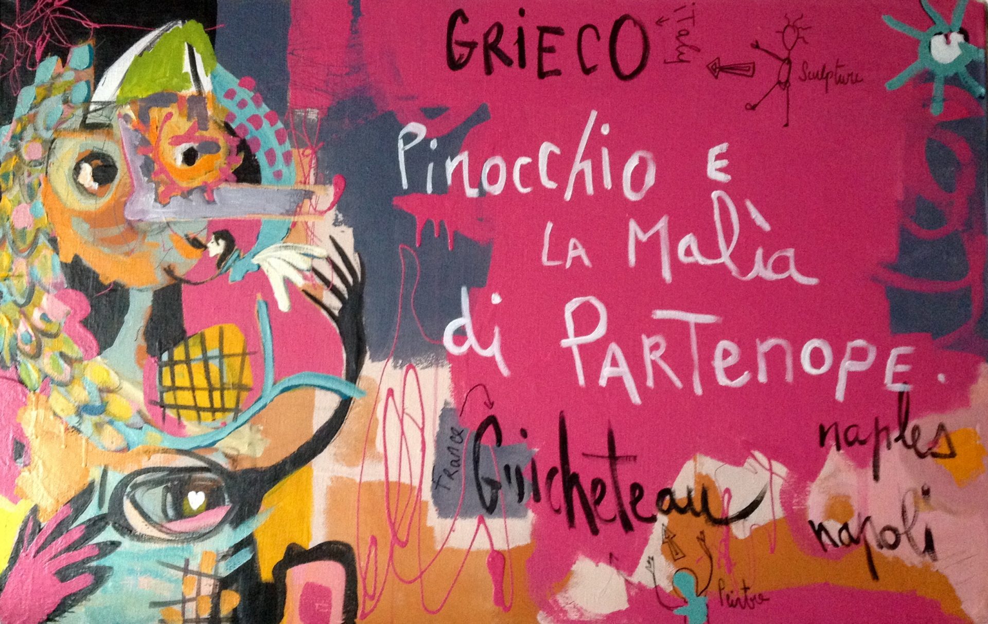 Dopo qualche mese, durante una residenza a Montemurro (Pz), per la realizzazione di un graffito per il Comune, la Guicheteau visita a S. Tecla (SA) l’atelier della Grieco che colleziona libri di Pinocchio del primo ‘900. Da questo re-incontro nasce il progetto.
