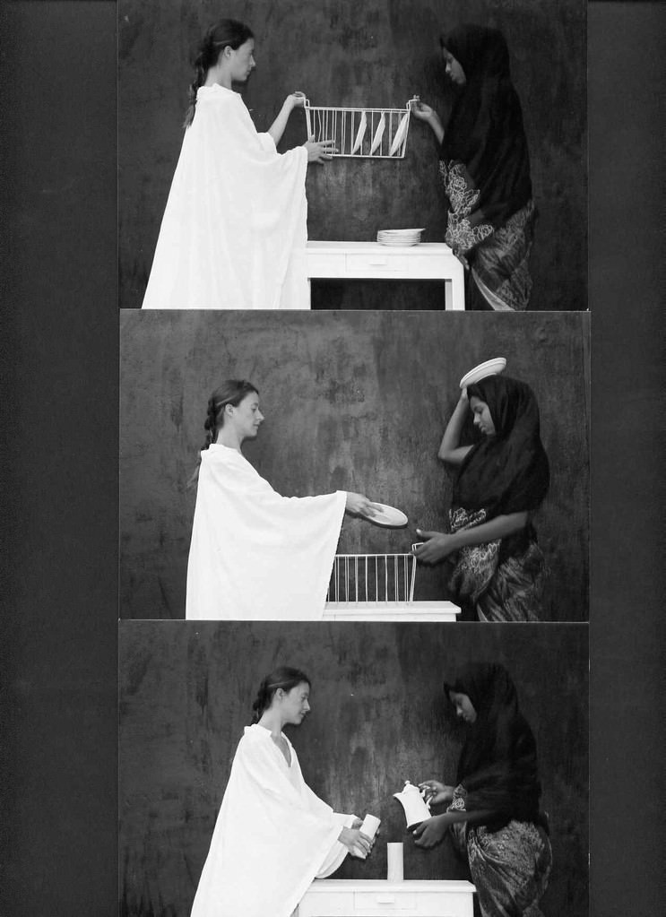 These two sisters of different race and religion meet in such ecstatic moments as when they open the fridge which radiates a mystic light or a chat over a cup of coffee. The artist captures moments from their daily life, juxtaposing static situations with movement such as choosing a dress, packing, meeting at the front door, or such as the photo of the sisters planning an imaginary home.