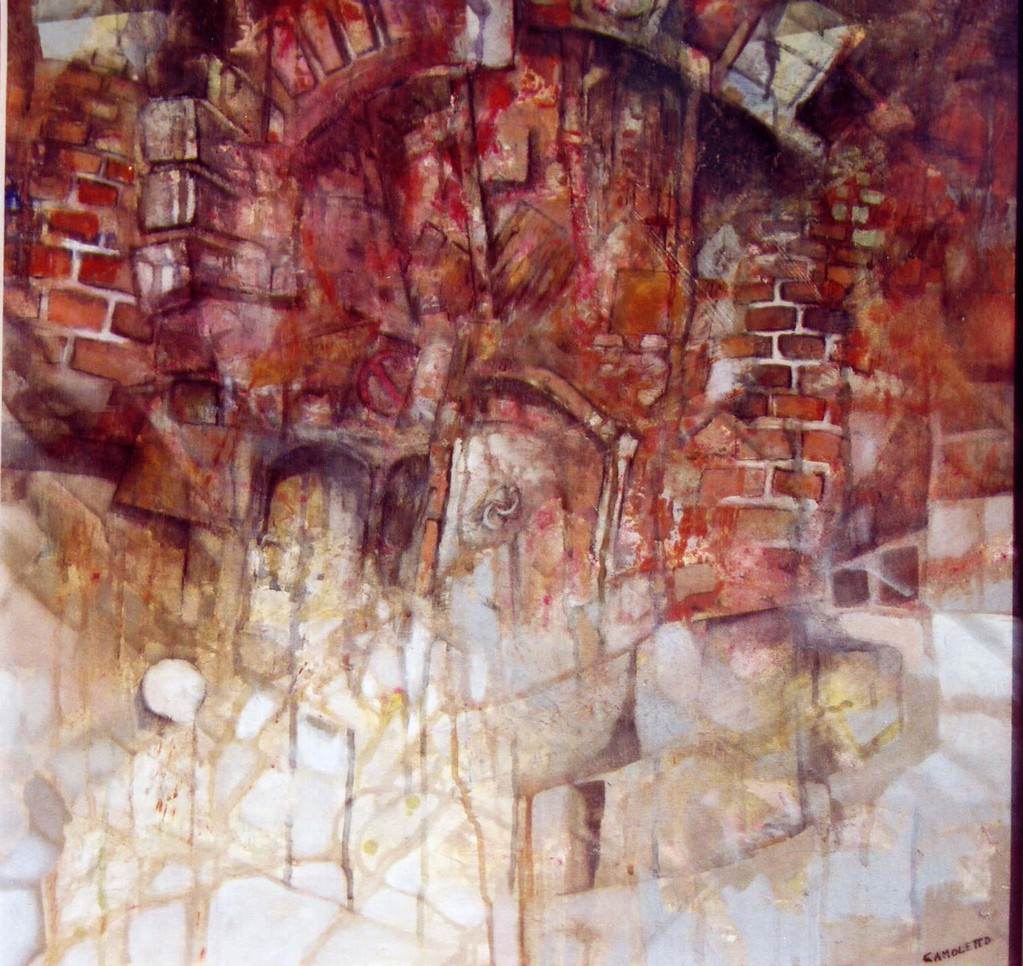 Mario Camoletto vive e lavora a Volpiano (To). Le sue opere sono formate da pittura e rilievo: l'artista aggiunge materiali nell'attuazione del dipinto, dando un effetto tridimensionale di grande suggestione. Rappresenta portoni squarciati, frammenti di legni, muri con manifesti affissi, portoni segnati dal tempo. La sua, come ci fa notare il critico Lella Durando, “è un'arte avanzata, calata nella conoscenza di varie correnti artistiche, di espressione pittorica personalissima, di grande effetto ottico, con squarci, riporti, larghe pennellate, legno usurato e lasciato vibrante in libertà. Assemblages di forte intensità, composizioni che tutto svelano e al tempo stesso tutto celano”.