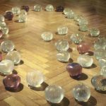 La Cripta di San Michele Arcangelo fa da cornice e viene riempita quasi nella sua interezza da una installazione, La gioia di nascere, realizzata appositamente per dialogare con lo spazio espositivo ed integrarsi alle caratteristiche architettoniche. Un fondo azzurro-blu ricorda l’acqua che rende lo spazio pieno di riflessi incerti ed effimeri. Si intravvedono, poi, spiragli di vita autonoma, organismi in un mondo tutto loro, con l’acqua che rappresenta la protezione dei feti, realizzati in vetro. Il mare evidenzia come la natura possa ricordare coinvolgimenti ameni e catastrofici.