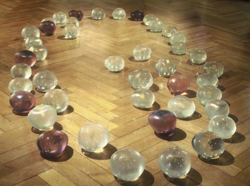 La Cripta di San Michele Arcangelo fa da cornice e viene riempita quasi nella sua interezza da una installazione, La gioia di nascere, realizzata appositamente per dialogare con lo spazio espositivo ed integrarsi alle caratteristiche architettoniche. Un fondo azzurro-blu ricorda l’acqua che rende lo spazio pieno di riflessi incerti ed effimeri. Si intravvedono, poi, spiragli di vita autonoma, organismi in un mondo tutto loro, con l’acqua che rappresenta la protezione dei feti, realizzati in vetro. Il mare evidenzia come la natura possa ricordare coinvolgimenti ameni e catastrofici.