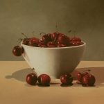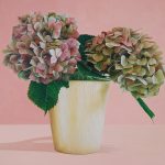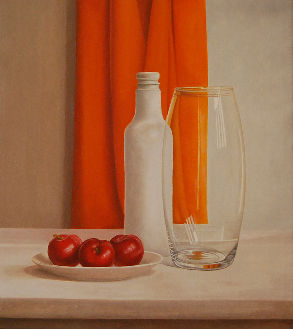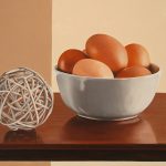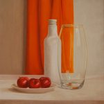 Il disegno iniziale è perfetto, attento nel cogliere ogni dettaglio anche lo sfondo gioca un valore assoluto nella suggestione della rappresentazione, sia quando si presenta in coerenti tonalità, sia quando ricerca impercettibili variazioni di una sola cromia. È un continuo interagire quello di Patrizia con oggetti domestici composti con rigore essenziale: poche forme organiche, talvolta isolate, accostate, appoggiate su un piano che marca ed esalta le tonalità dello sfondo e l’eleganza compositiva.