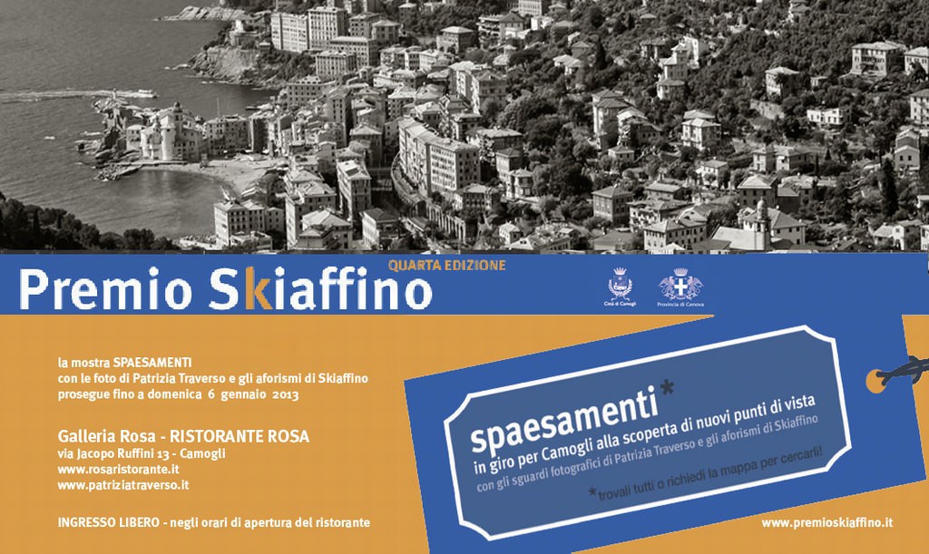 durante l'inaugurazione sarà presentato il bando del concorso nazionale "SPAESAMENTI - Alla scoperta di nuovi punti di vista", iniziativa realizzata in occasione della IV edizione del Premio Skiaffino, promosso da Città di Camogli e Provincia di Genova in collaborazione con ASCOT e Pro Loco di Camogli, e curato da Barbara Schiaffino e Ferruccio Giromini