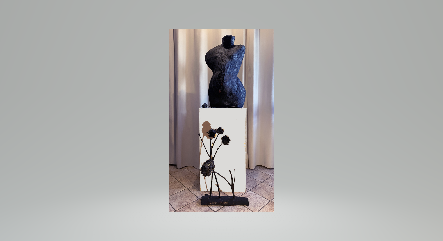 Le sculture Arsa Mater, Muta Mater e Mutans Mater si presentano come totem arcaici, presenze monumentali dai volumi essenziali che evocano l’archetipo della Grande Madre. Raccolgono un senso di origine e di forza primordiale, trattenendo il respiro di tempi remoti e rendendo visibile la tensione tra vita, trasformazione e permanenza.