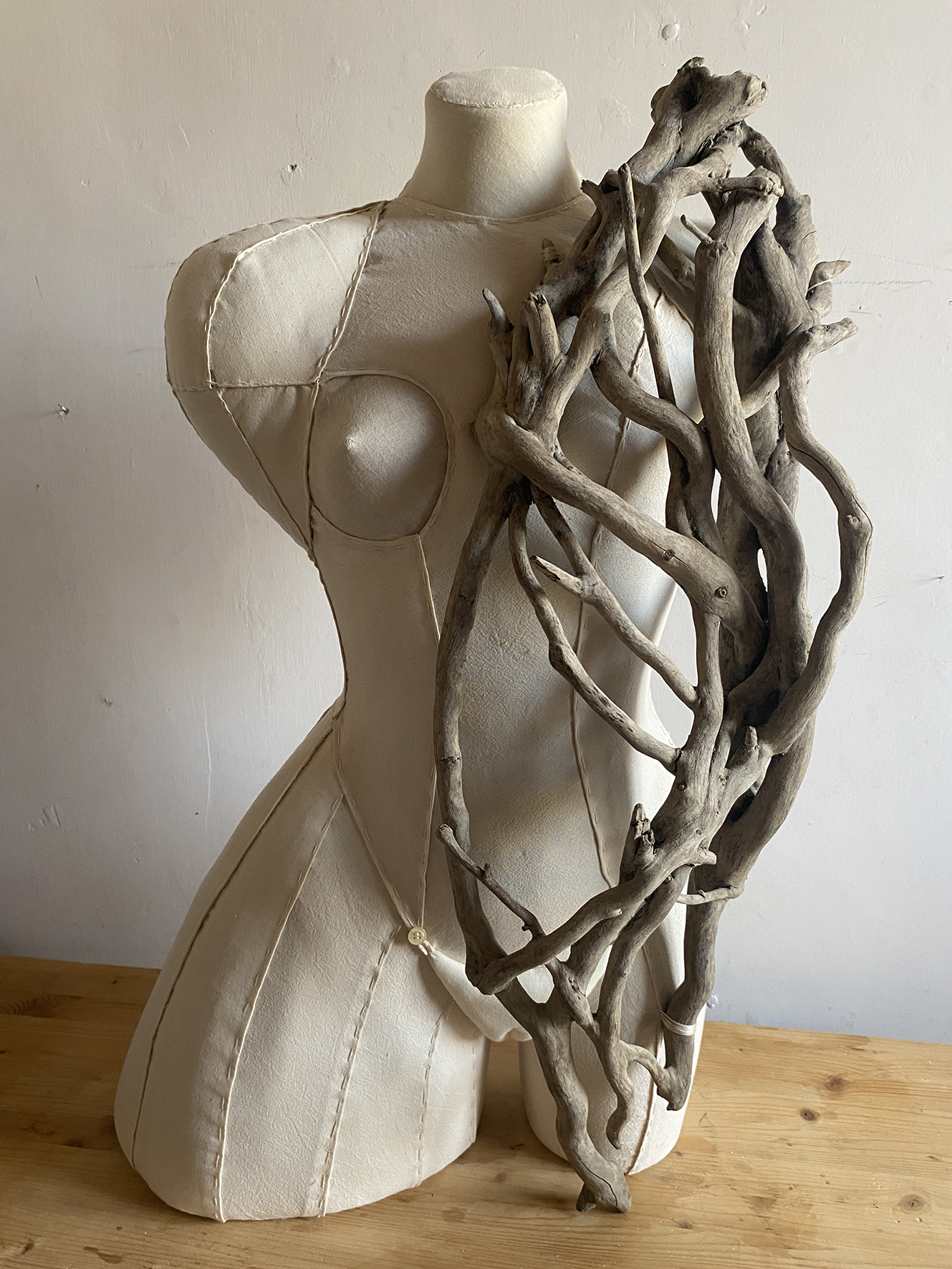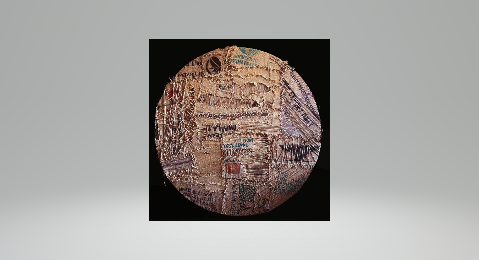 L’arazzo Vulnera Mater – la Madre delle ferite – è un grande cerchio tessuto da corde intrecciate che incidono la superficie come una trama di cicatrici. La topografia irregolare che ne emerge evoca una mappa simbolica del mondo contemporaneo: tracciati umani sovrapposti che ridisegnano e consumano la pelle della Terra. L’opera diventa così un archivio della memoria, una pelle che trattiene ciò che è stato plasmato, sfruttato, segnato. Il secondo arazzo, Consumpta Mater, è realizzato come un patchwork di sacchi di juta provenienti da diverse aree del mondo, ricuciti con corde-sutura che attraversano la superficie. Le irregolarità delle trame raccontano economie distanti, filiere globali, pressioni produttive e industriali impresse nel tessuto come cicatrici di un sistema che consuma senza tregua. In Grembo Matris rappresenta infine un corpo simbolico, modellato come una guepière, che accoglie nel proprio ventre frammenti eterogenei: plastiche deformate, legni levigati dall’acqua, detriti naturali e scarti industriali. Da questa fusione inattesa nasce un organismo ibrido, una materia che sembra inaugurare un nuovo linguaggio, un sistema che muta annunciando un cambiamento profondo.