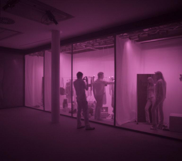 Paul Cocksedge ha selezionato i tratti fondamentali del mondo Trussardi e ne ha individuato le icone: segni riconoscibili di un’eccellenza che racconta il passato, il presente e il futuro della casa di moda. Visibili soltanto attraverso i raggi infrarossi emessi dalle macchine fotografiche digitali e dai cellulari, gli oggetti di design, gli abiti, gli accessori e ogni altro frammento significativo dell’universo Trussardi - nascosti dietro a un materiale dalle straordinarie proprietà - compaiono allo sguardo dei visitatori svelati come dall’illusionismo tecnologico di Paul Cocksedge.