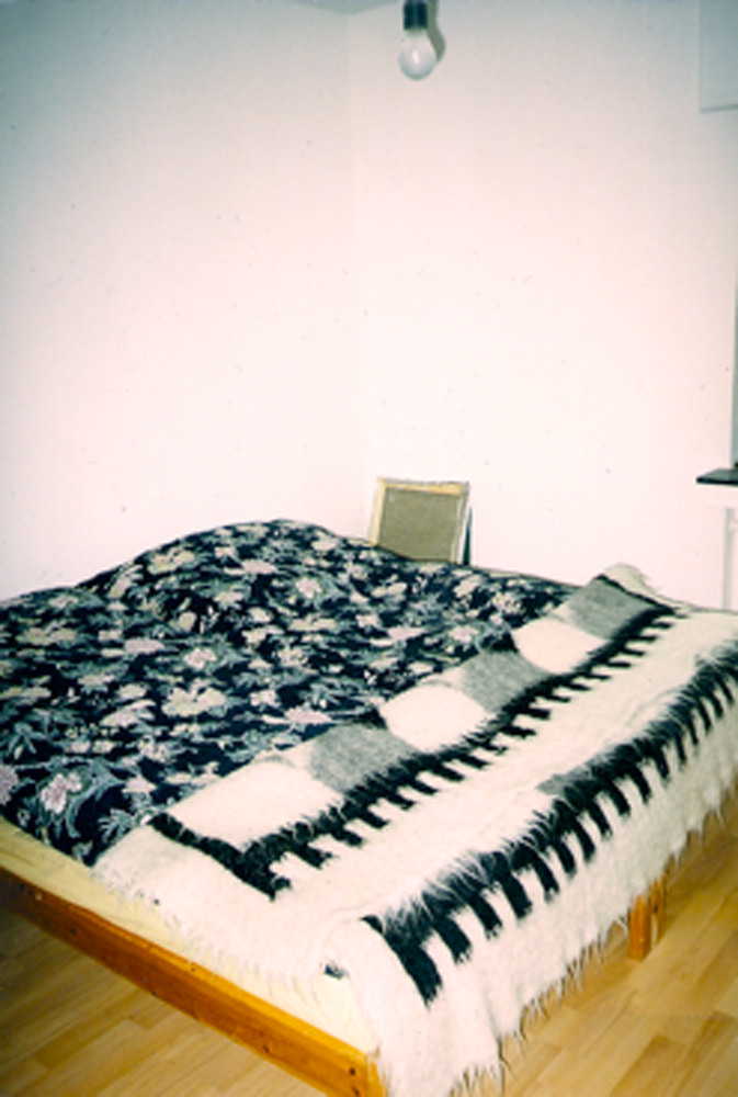 Il wall painting, studiato appositamente per lo spazio della galleria, è realizzato attraverso l’utilizzo delle tele come transfer performativo del materiale pittorico. I pigmenti di colore acrilico che l’artista stende sulla tela, la trapassano sino ad arrivare a trasferirsi sul muro.