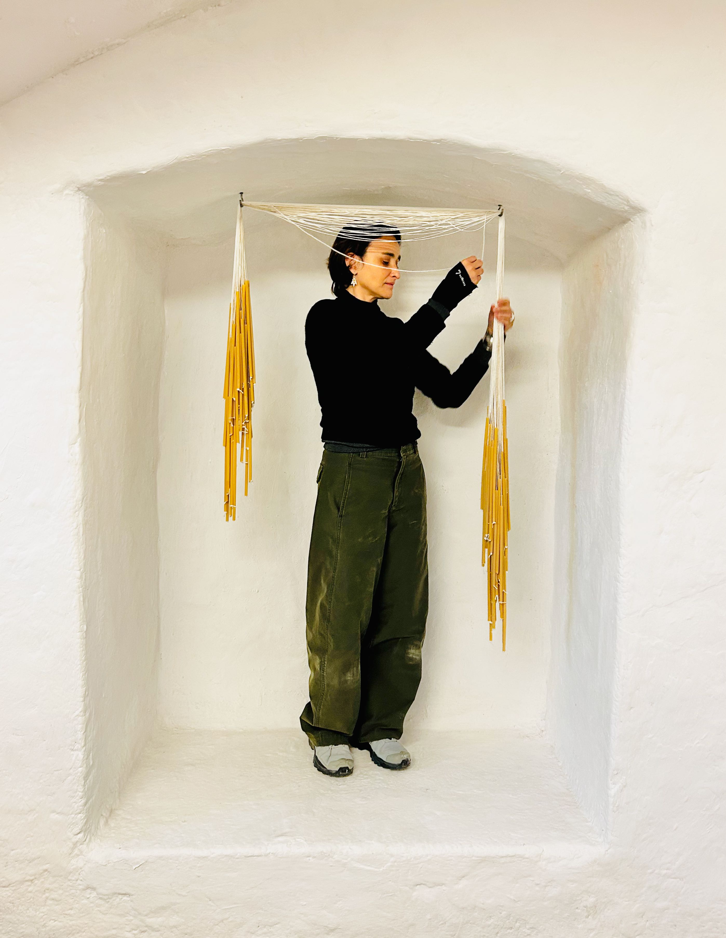 Nell’installazione al Chiasso Perduto, spazio che si trova sulla soglia tra il visibile e l’invisibile e dove un tempo si svolgevano azioni domestiche, l’artista utilizza la pasta secca come simbolo della dispensa, per metterci a confronto tra l’identità e la sua dissoluzione. Questa tensione c’è fin dal primo gesto: il simulacro delle candele che ci accolgono e che non possono essere accese; una promessa di luce che non si compie, o forse un invito a pensare che la luce che cerchiamo non esista nella forma in cui la immaginiamo. L'artista evoca i dispositivi monastici che permettevano di ricevere il cibo senza mostrarsi, o le piccole aperture attraverso le quali i prigionieri comunicavano, oppure le grate che separavano il popolo dai religiosi o dalle donne nelle chiese, creando confini che impediscono di vedere ma non di ascoltare, ascoltare senza parlare, esistere nel silenzio e quindi scegliere l’invisibilità.