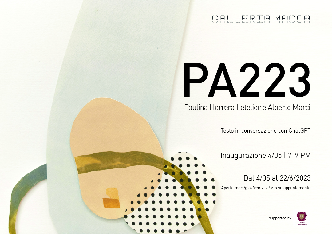 Galleria Macca è lieta di presentare PA223, un progetto site-specific di Paulina Herrera Letelier (Santiago de Chile, 1978; vive e lavora a Cagliari) e Alberto Marci (Cagliari, 1985), e il testo critico di ChatGPT (ArtificiaI Intelligence, 2023). La mostra sarà visitabile dal 4/05 al 22/06 2023.