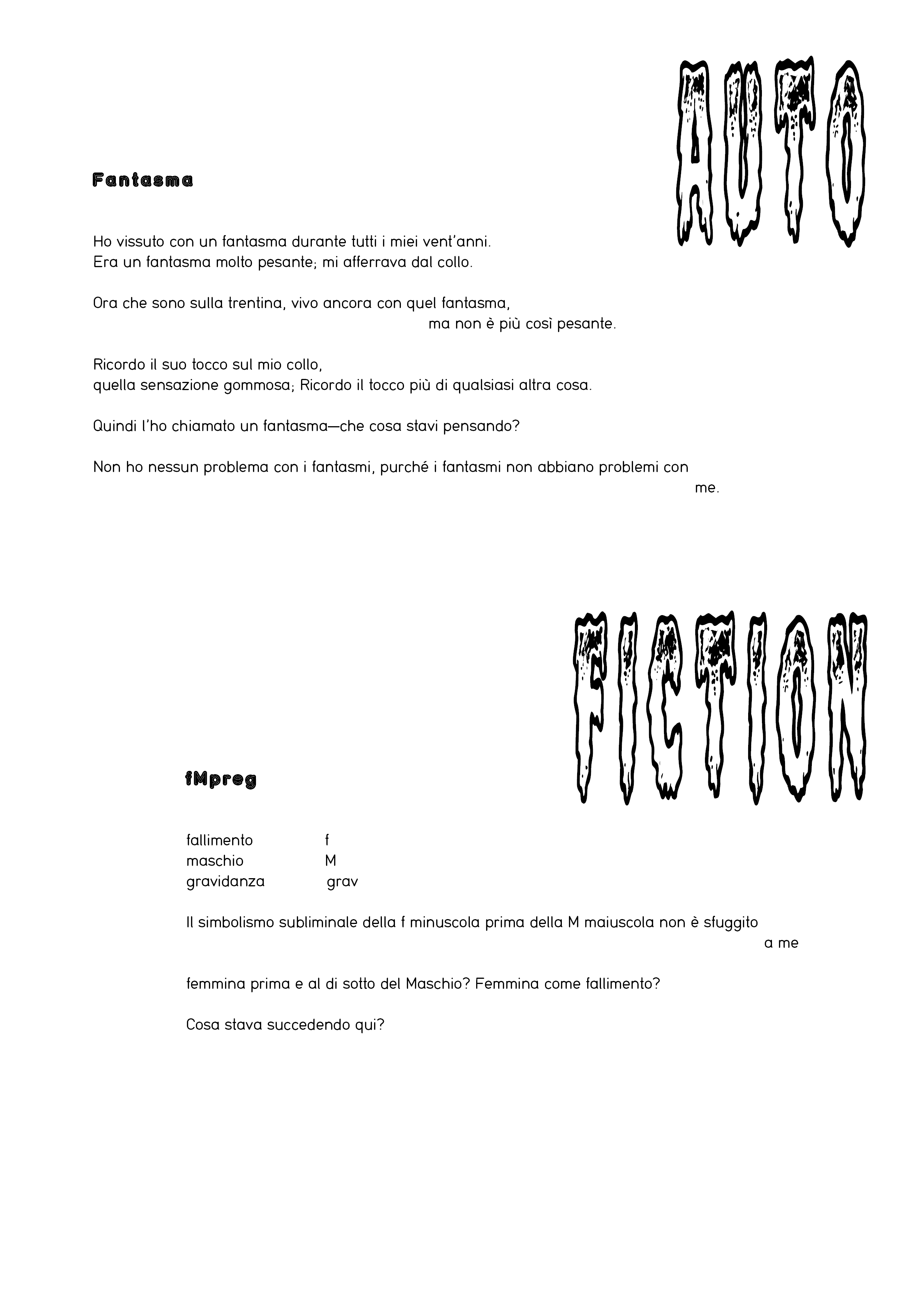 Costruendo una nuova narrativa sui trapianti ovarici, l'artista immagina un futuro dove sia l'uomo a produrre gli ovuli. Autofiction continua su questo percorso, ancora come un lavoro di finzione, ma non così lontano dalle ricerche che si stanno portando avanti in ambito medico-scientifico sulle terapie ormonali e sui trapianti. Questo immaginario è atto a sviluppare la possibilità di un pensiero sulle dinamiche di potere fra generi: chi “possiede” l'atto della riproduzione, la storia della scienza, il controllo dell'uomo sulla vita della donna; la riduzione del genere femminile ai minimi termini biologici (ossia la donna come l'essere umano atto alla riproduzione); come tutto ciò sia in tensione con l'attuale concetto di normalizzazione della cultura gay e come l'ascesa di corpi trans e non binari cambi i ruoli di genere e culturali.