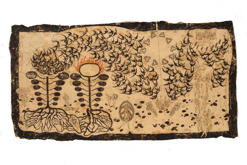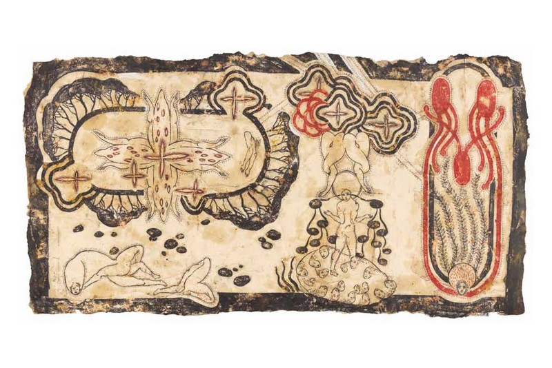 «Burland – spiega il curatore – è un autodidatta, da sempre associato alla Collection de l’Art Brut di Losanna. I suoi lavori sono caratterizzati da modalità espressive rituali e artigianali, da una ricerca che si avvale del folklore e di diverse forme di cultura contemporanea. Pellegrini è docente di Pittura dell’Accademia di Belle Arti di Bologna. La sua formazione accademica si riverbera anche nelle sue composizioni: tecniche miste che fanno uso della monotipia. Gli artisti sono tuttavia accomunati dall’utilizzo della carta come supporto ricorrente e dall’invenzione di alfabeti di forme con cui generano un universo di possibilità espressive».