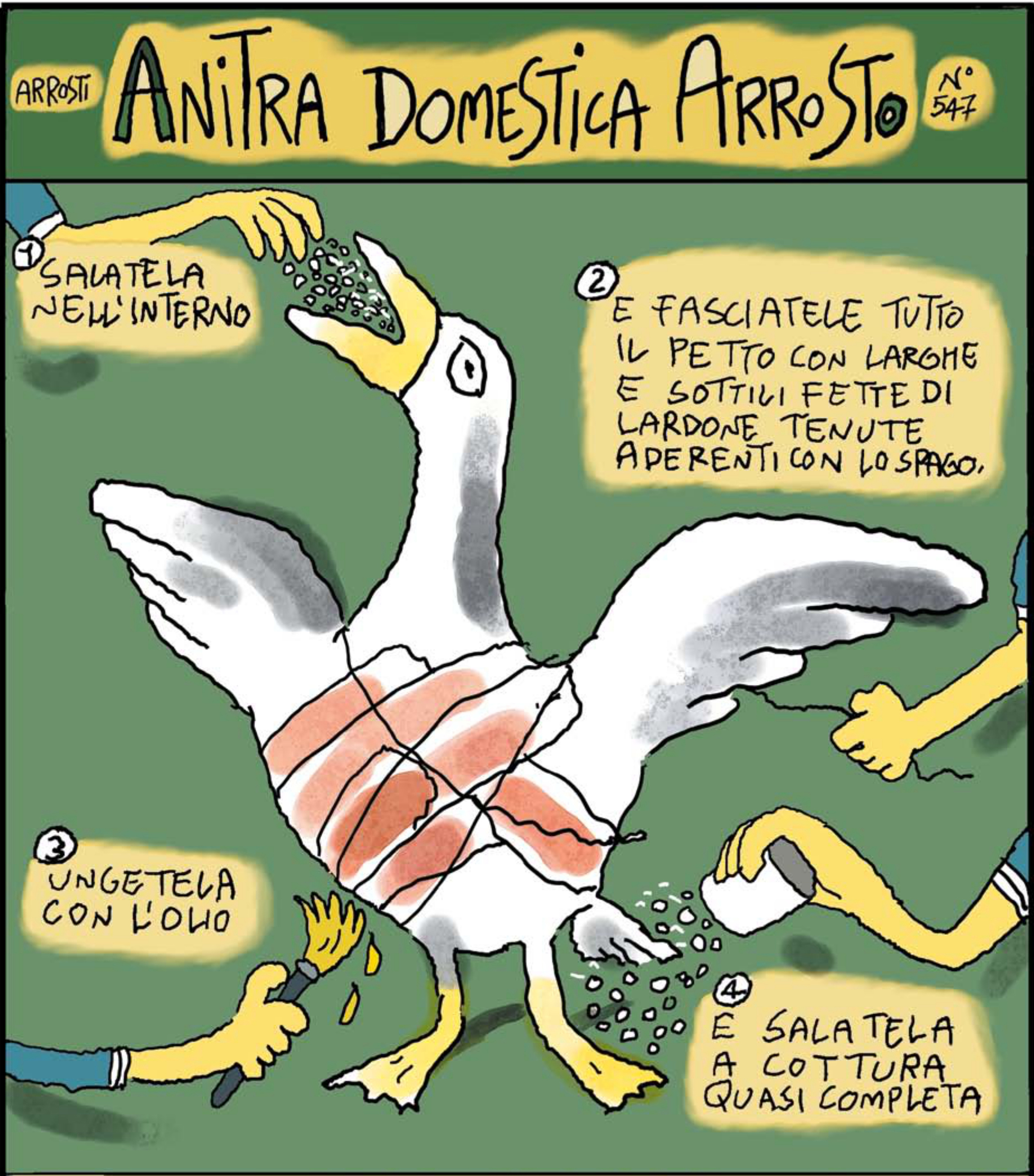 Alberto Rebori con grande intelligenza e sensibilità ha saputo rapportarsi alle ricette originali, trascrivendo le frasi e le parole di Artusi in testa alle vignette e nelle nuvole presenti ogni tavola, dando loro una vita nuova, in sintonia con il suo mondo che ribalta con poeticità luoghi comuni e convenzioni del mondo culinario. Animali, verdure, cibi, stoviglie si animano di vita propria nella cucina dove Rosa e Vittorio – zii dell’illustratore, eterni protagonisti delle sue storie – eseguono le varie ricette. E così il pane protesta ad essere affettato in “Sandwichs, ricetta N. 114”, i piccioni si interrogano se la loro miglior morte sia in umido coi piselli in “Piccione coi piselli, ricetta N. 354” e la faccia di quel prete romagnolo, soprannominato Don Pomodoro perché “cacciava il naso da per tutto”, si trasfigura in ortaggio in “Salsa di pomodoro, ricetta N. 125”. Come scrive Alberto Capatti nel testo introduttivo, l’artista “traduce le ricette in animazione, distribuisce ruoli, scrive, per ognuna, il copione, le rivive dall’interno, con il cuore che batte, la bocca che ride e un disegno che stana i segreti gastronomici”.