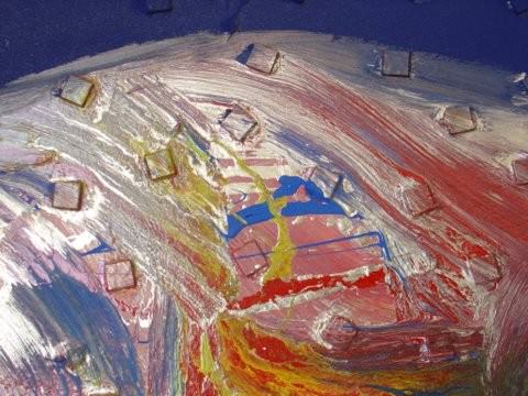 Le tele sono circondate da calmi mari d’acrilici, luminosi , dove i colori primari spalmati a strati vengono spruzzati di riflessi dorati o argentati .