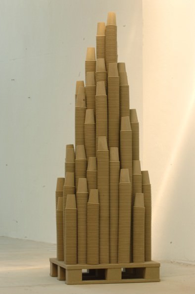 Tubi di plastica e vetroresina diventano colonne di bicchieri di carta in tutto simili a castelli di sabbia, in cui l’immediatezza della percezione visiva permette di scorgere l’idea di una metropoli con fondamenta che poggiano su pilastri usa e getta.