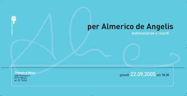 Un incontro per ricordare Almerico de Angelis (24 gennaio 1944 - 1 agosto 2005), prematuramente scomparso lo scorso agosto, architetto, titolare della cattedra di design al Politecnico di Milano, dal 1996 direttore della rivista "MODO", fondatore nel 1992 con Alessandro Mendini della Piccola scuola, ma anche consulente di aziende leader nell'ambito del design, Presidente della Camera Italiana per il Design, della società di promozione del Design DAA 1 e Art Director delle Giornate Napoletane del Design.