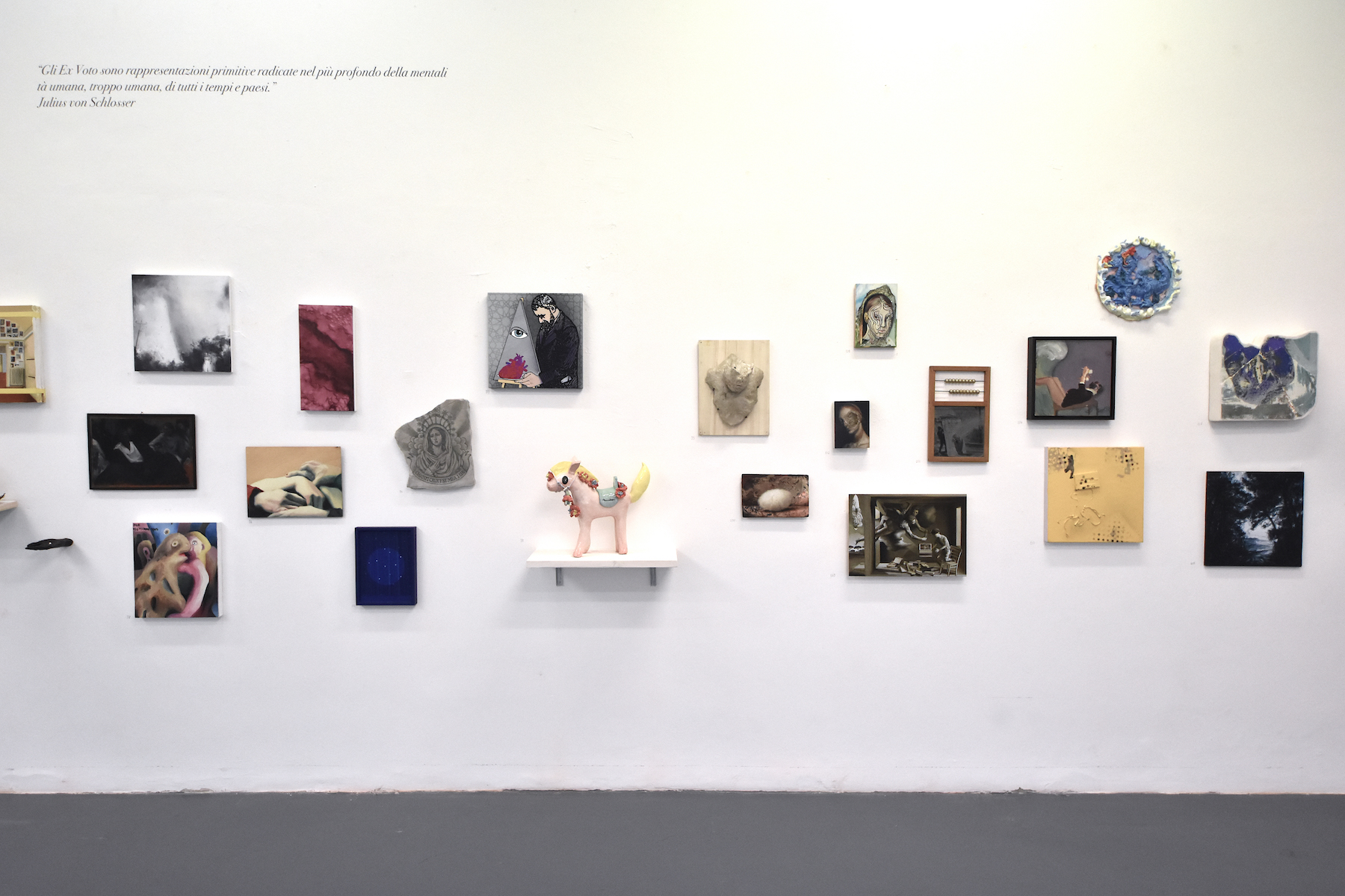 Per sottolineare il concetto diventa cruciale la cornice allestitiva, che evoca il tradizionale modo in cui gli ex voto vengono solitamente collocati: una composizione suggestiva, che richiama l'atmosfera delle chiese, dove "i manufatti allegorici" creano una sorta di accumulazione organica, una stratificazione temporale tipica dei luoghi di culto, dove gli elementi votivi di ringraziamento e di devozione si sovrappongono creando un rapporto di dialogo complesso e profondo. Il visitatore si ritrova così immerso in un'esperienza che invita alla riflessione ed alla contemplazione. In questo contesto, l'ex voto diventa un mezzo attraverso il quale gli artisti ci esortano a esplorare le relazioni con il sacro, la fortuna e il destino, offrendo una riflessione profonda sulla condizione umana e sulla ricerca di conforto e speranza.