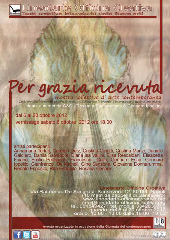 Sabato 6 ottobre Lineadarte Officina Creativa per la Ottava giornata del Contemporaneo promossa dall’AMACI è lieta di proporre la mostra d’arte contemporanea “Per grazia ricevuta”. L’uomo per secoli accompagna il suo cammino ad un intrigante ed affascinante dialogo tra la sua vitalità e la presenza – essenza del divino. Questa mostra si propone come intensa riflessione, che, idealmente rimanda agli ex voto, quale genesi personale tra l’uomo e la divinità. L’ex voto di norma è una espressione di devozione creativa tra la divinità e il fedele, di solito il “miracolato” offre al divino un oggetto realizzato con vari materiali, abitualmente miniati o istoriati su telao latta, dagli ex-voto generalmente emergono due elementi fondamentali: un’ illustrazione della “disgrazia” o della preghiera narrativamente romanzata, e la rappresentazione del santo o della divinità che ha esaudito le necessità del fedele. Altra interpretazione potrebbe essere l’aver ricevuto una “Grazia” inteso come dono o talento, vox popoli così direbbe .In quest’occasione verranno presentati anche i nuovi spazi di LIneadarte Officina Creativa che da Via San Domenico Soriano (Piazza Dante) si sposta nel Centro Antico in via Raimondo De Sangro di Sansevero 12.L’esposizione sarà visitabile dal 6 al 20 ottobre 2012 per info e contatti : 0815494271 oppure info@lineadarte-officinacreativa.org