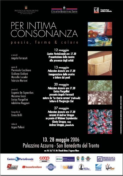 La Mostra che avrà per tema la consonanza poetica tra le arti visive e quelle letterarie, vedrà la partecipazione di quattro artisti piceni: Fabrizio Mariani, Giuliano Giuliani, Marcello Lucadei e Piernicola Cocchiaro che, attraverso le loro ricerche espressive diversificate (pittorica, grafica-pittorica, grafica-pittorica-fotografica e scultorea) cercheranno con le loro opere, di evidenziare, risaltandolo, il contenuto poetico nella e dell'arte visiva.
