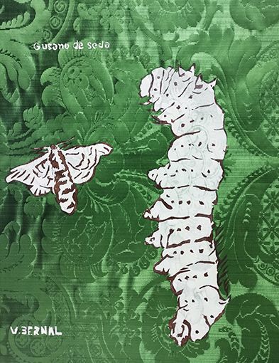 Sono proprio i damaschi di San Leucio il filo di seta che unisce in questa mostra quindici artisti italiani e spagnoli. Ciascuno lascia sulla seta il segno dell’immaginazione e del proprio tempo, VENTUS TEXILES di Alberto Balaguer fa fiorire sul prezioso damasco il ricordo dell’antica civiltà, quella classica che unisce i nostri popoli, Virginia Bernal , depone con sapiente delicatezza sul verde splendore della seta gli artefici di tanta bellezza: IL BACO E LA FARFALLA .