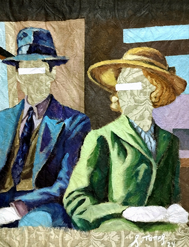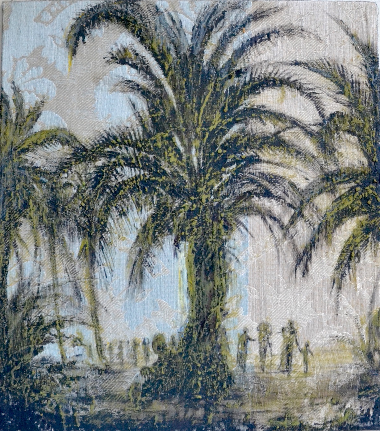 SOSTA IN DAMASCO : si compiace di un giuoco di parole Antonio Ciraci che evoca un paesaggio esotico, come fu sempre esotica la seta per gli europei. CARAVANSERRAGLIO di Carlo De Lucia allude al nostro tempo attraverso la parola araba che ricorda i viaggi delle carovane con le quali la seta viaggiava. In MATURARE CON LA SOFFERENZA Xavi Ferragut infligge alla preziosa bellezza del damasco la traccia della violenza e della sofferenza: anche questo è la storia. Peppe Ferraro in STRATIFICACIONES pone l’accento sulla materia serica, di cui evidenzia colore e luce. In VIDA di Kraser emerge dalle volute della seta un volto infantile privo di sguardo, ricorda forse un frammento di classica scultura, una storia tradita? Marcello Gallo in OMBRE disegna una folla di volti sul damasco blu: è l’umanità che passa nei secoli, evocata dalla seta e dal suo passato ? Nella PIOGGIA D’ORO Mario Lanzione esalta la luce blu del suo damasco cui aggiunge lo splendore dell’oro ed il turbamento dello specchio. Battista Marello nella sua PESCA MIRACOLOSA ricama sulla seta. SENZA IDENTITA’ di Salvador Torres: le volute del damasco sottolineano l’assenza dei volti nelle due figure; è la vacuità, la disumanizzazione del nostro tempo. Enzo Trepiccione entra invece NEL GIARDINO DEL MAGO, e nella dimensione del sogno, traendone gli umili archetipi di autentico valore : cose di poco conto cui la seta dona splendore. Ilia Tufano, chi scrive, in FUOCO ALL’ORIZZONTE innesca fiamme a minacciare il damasco, preziosa testimonianza di storia, di civiltà. Brandelli di stoffa, ferro rugginoso ospitano figurine ritagliate nella carta in SENZA TITOLO di Vittorio Vanacore e le preziose volute della seta sembrano memorie di un naufragio. LA PREGHIERA di Antonio Vidal Maiquez evoca una notte stellata, forse fa appello al sentimento religioso: dovrebbero sentirsi fratelli gli uomini che vivono lungo le coste del Mediterraneo.